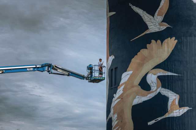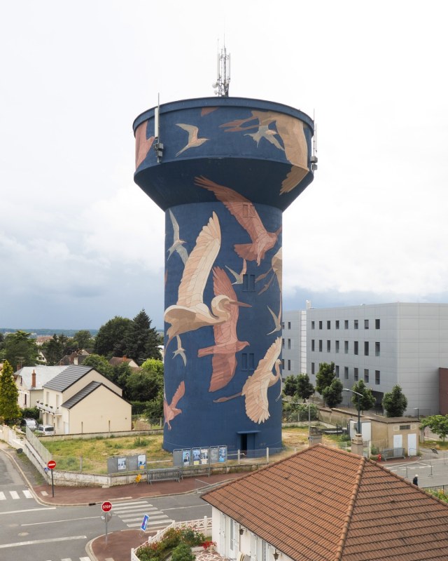 Nestled along the Loire River in France, the town of Gien has a new landmark thanks to the skills of street artist Taquen. The Spanish artist spent nearly two weeks in July transforming one of the town’s three water tanks into a piece of art. The result is a stunning monument that uses the artist’s delicate color palette to incorporate a variety of birds into the cement facade.