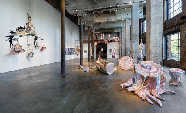 Working with the tattered remnants of consumer culture, artist Tamara Kostianovsky(previously) asks us to question the origins, process, and disastrous results of our seemingly unquenchable desire to buy and waste. Four distinct bodies of the artist’s work spanning fifteen years have been gathered at Smack Mellon in DUMBO, Brooklyn to form Between Wounds and Folds. The textile ecosystem of cow carcasses harboring new life, vibrantly hued cross-sections of trees, and colorful birds of prey, are constructed from repurposed fabrics and discarded textiles.