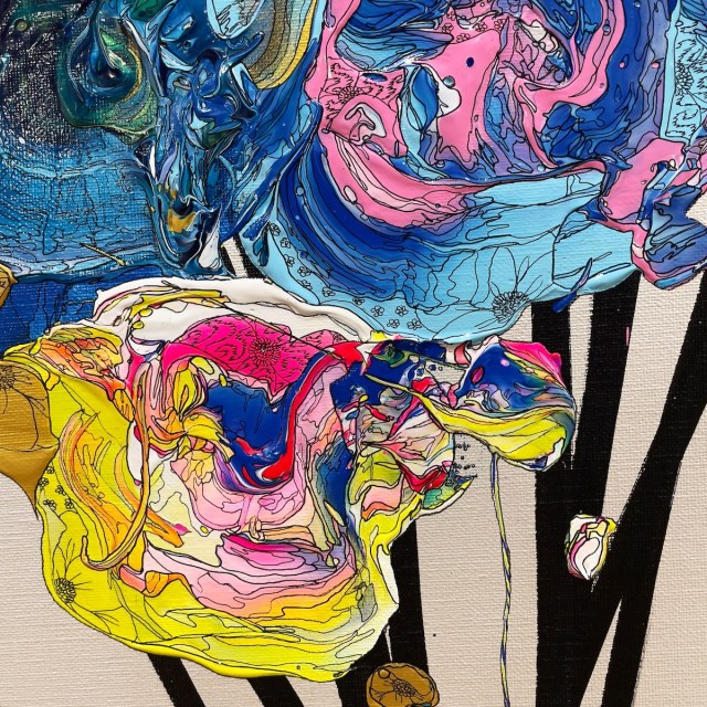 From afar, Yuta Okuda‘s artwork can resemble pressed flowers. But come closer and the blossoming bouquets reveal themselves to be something much more complex with an ambiguity that shifts between realism and the abstract. The Japanese artist uses blotches of acrylic paint, which he then combines with miniscule, delicate pen drawings to create petals and blossoms within each other.