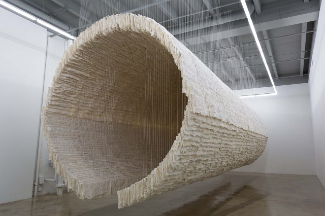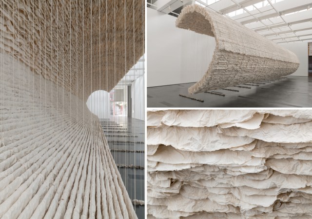 Spanning 18 meters long and seven meters wide, “Boat” is comprised of wrinkled paper layers draped around bamboo frames. Countless thin cotton threads hold the individual components in place and intersect the curved, tunnel-like form with straight lines that extend vertically to the ceiling. Bisected with a central space for viewers to pass through, the metaphorical work considers the passage of time and space and is an extension of Zhu’s 2007 installation “Wave of Materials” (shown below), which features a single, halved form anchored to the gallery floor with stones. […]