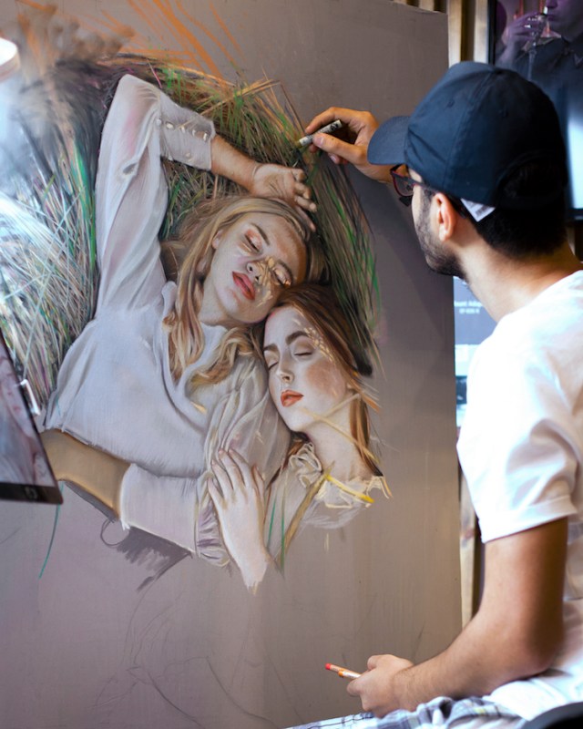 Not all paintings are made with paint pigment and a brush. Some are made with oil pastels. Egyptian artist Magdy Ghabn employs this malleable medium in his newest work depicting two women sleeping in a grassy field.