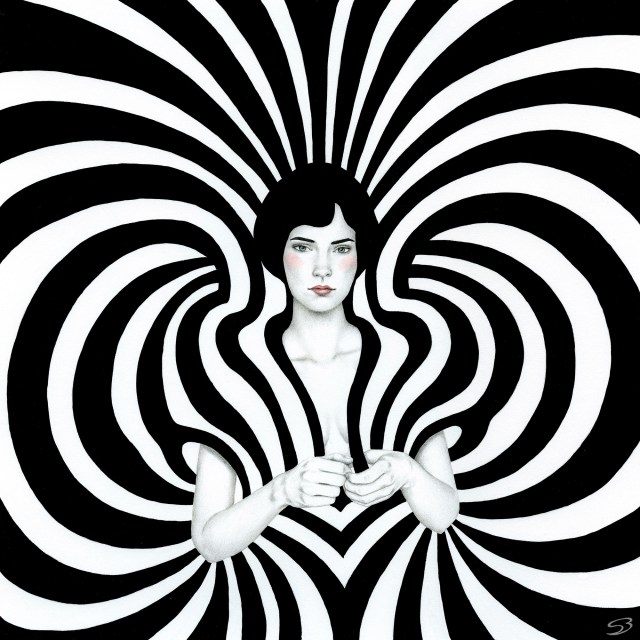 In the hypnotic portraits of Argentinian artist Sofia Bonati (previously), women find themselves embraced by backgrounds of black-and-white linework, foliage, and abstract geometries. The feminine characters often have rosy cheeks and earnest expressions, and they seamlessly meld with their patterned environments, which sometimes conceal the outlines of their figures and accentuate their unique facial features.