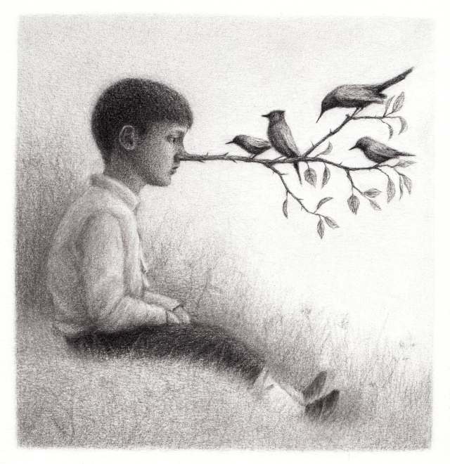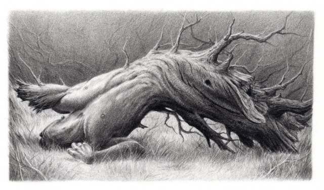 Continually fascinated by the potential of the human figure, Mexico-based artist David Álvarez(previously) illustrates richly textured scenes with a dose of fantasy and surrealism: a bird’s perch transfixes a character who’s sprouted a branch nose, a man writhes on the ground as he grows from a gnarled stump, and a Cheshire cat lifts a blanket to unveil a moon hidden beneath. Underlying many of his works is “the expressive force and the gesture of the human body,” Álvarez tells Colossal, themes that are rendered through highlights and dense markings in graphite that add intrigue and mystery to the monochromatic depictions. […]