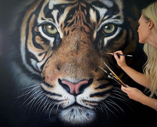 Although UK-based artist Julie Rhodes doesn’t live near the natural habitat of big cats, she celebrates the majestic beauty of lions and tigers in massive acrylic paintings. These realistic works capture the many fine details of large felines, from their intricate fur patterns to their graceful silhouette and thick coats.