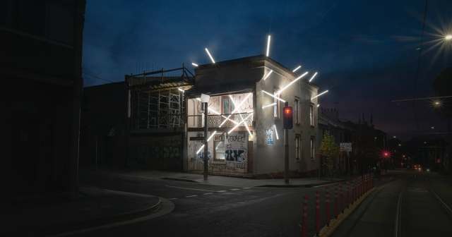 Tagged with graffiti and marred by a chipped facade, a stately Victorian home in a Sydney suburb is the site of a brilliant site-specific installation by artist Ian Strange. “Light Intersections II” uses angled beams of light to impale the derelict structure and permeate outer walls, windows, and the ornate, metallic railing on the second-floor balcony. Illuminating the battered building, Strange’s monumental public work is one of his many projects that explores ideas of home through architectural interventions.