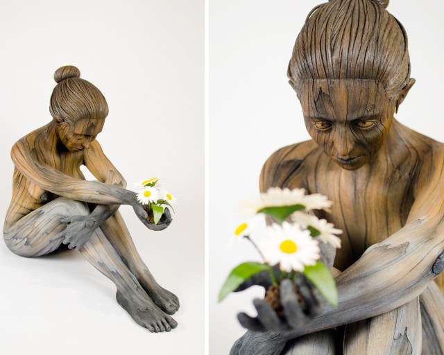 To achieve such a hyperrealistic finish, each piece undergoes multiple rounds of detailing—head to Instagram for a glimpse behind-the-scenes—which White starts by shaping the initial form with knots and branches and imprinting large grooves for the grain. After the work dries slightly, dental instruments, wire brushes, and Xacto knives aid in crafting the more intricate components, and the slightly dehydrated material lends itself to natural cracks and divots that enhance the woody texture. Once fired, the artist paints each sculpture with a largely neutral palette of acrylics. […]