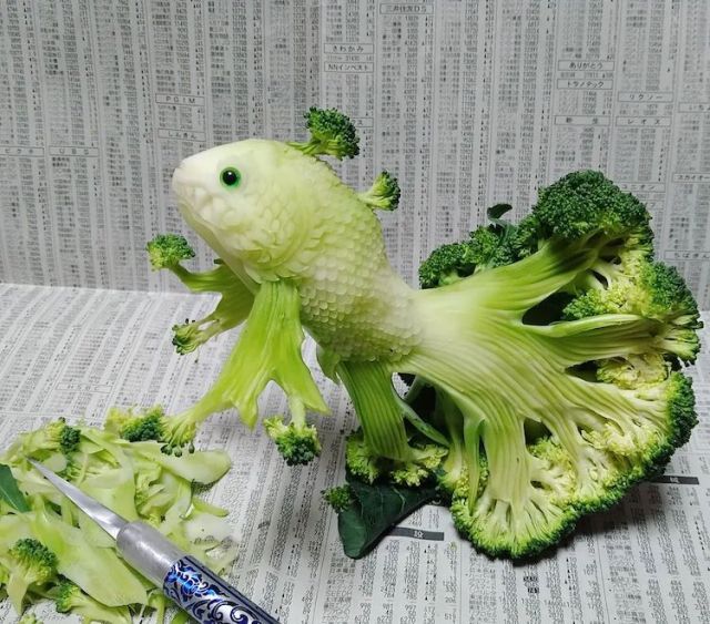 Japanese food artist Gaku is known for his intricate food carvings. The meticulous artist has made a name for himself using the traditional craft of Thai fruit carving. But he also specializes in the Japanese technique known as mukimono, which involves carving images into the skins of fruits and vegetables or shaping them into elaborate forms. While he often directs his precision knife towards fruit, of late the artist has incorporated more vegetables into his art. And recently, one detailed carving of a fish made out of a fluffy stalk of broccoli has taken the internet by storm.