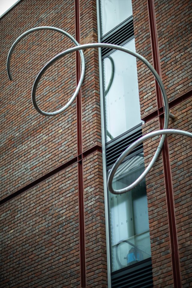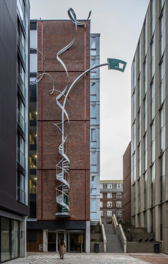 by Alex Chinneckunfurls into individual metallic ribbons as it climbs a brick building in Brighton. The latest work by the British artist, titled “A Spring in Your Step,” is made of galvanized steel and features a base with slatted rungs that gradually unwind into a trio of strips splaying outward over Circus Square.