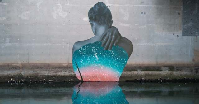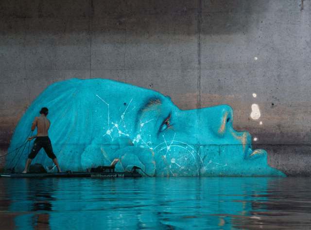 To paint his murals, Sean Yoro, aka Hula, yields to the shifting tides of the ocean. The Los Angeles-based artist (previously) paddles out to underpasses and concrete barriers only accessible by water where he balances on a surfboard with a minimal number of supplies—all paints, brushes, and other materials have to fit within the 10-foot space. There he renders portraits of women half-submerged in the sea and singular hands that appear to burst from the surface. “I had to learn not only a faster and more efficient way to paint while on a surfboard but also blending layers together needed to be able to adapt to the tides and other variables that might restrict certain areas of the wall,” he shares.