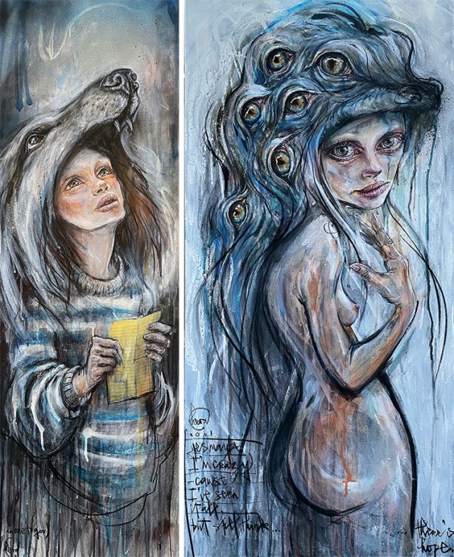 An Ode to You,” acrylic paint, spray paint, charcoal on canvas, 47.2 x 15.75 inches | “Seen It All and Still Have Hope,” acrylic paint, spray paint, charcoal on canvas, 39.4 x 19.7 inches