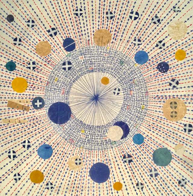 This cartographic interest permeates the artist’s current body of work, which features dots, stars, dashes, and concentric circles arranged in vast systems and imaginary cosmic charts. […]