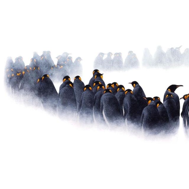 How beautiful is this painting of emperor penguins walking in a snowstorm?