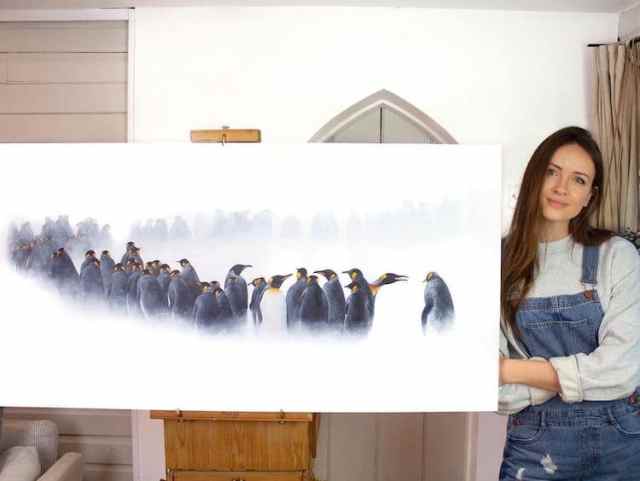 People from around the world love penguins. These iconic animals have inspired many artists and creative projects, including the photo of the two widowed penguins and a series about life in antarctica. British artist Sophie Green—who is known for her hyperrealistic depictions of wildlife—captured a group of emperor penguins walking in a snowstorm in her acrylic painting, The March.