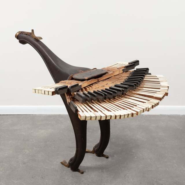 “Piano Bird” (2021), piano legs, keys, and wiring, 34 x 32 1/2 x 42 inches. Photo by Joerg Lohse. All images courtesy of Alexander and Bonin, New York