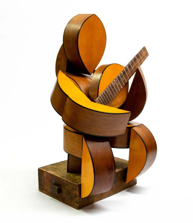 “Picker” (2022), Yamaha 3/4 size acoustic guitar parts, 27 x 15 x 15 inches. Photo by Joy Whalen