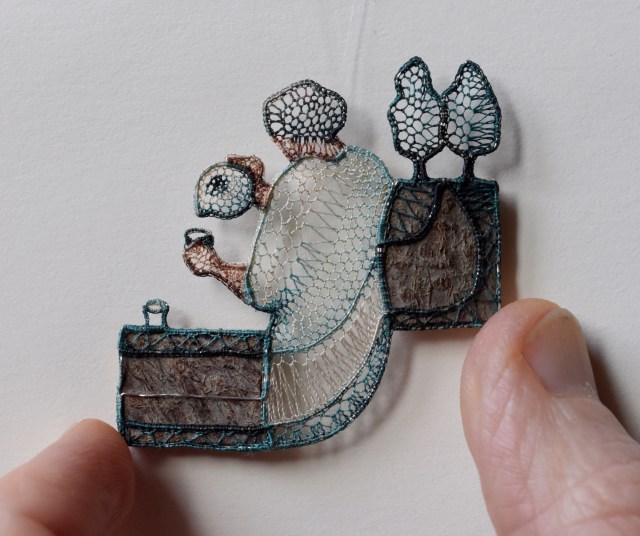Strands of silk thread are delicately intertwined to create inviting pastoral scenes in miniature needlework sculptures by Ágnes Herczeg (previously). The Hungarian artist has recently begun to incorporate found driftwood into her pieces, foraged from the shores of the nearby Danube River where floodplain trees dot the riverside. Drawing inspiration from her surroundings, Herczeg’s subjects include animals, trees, landscapes, and women performing tasks like pouring tea, weaving, or taking a walk. […]