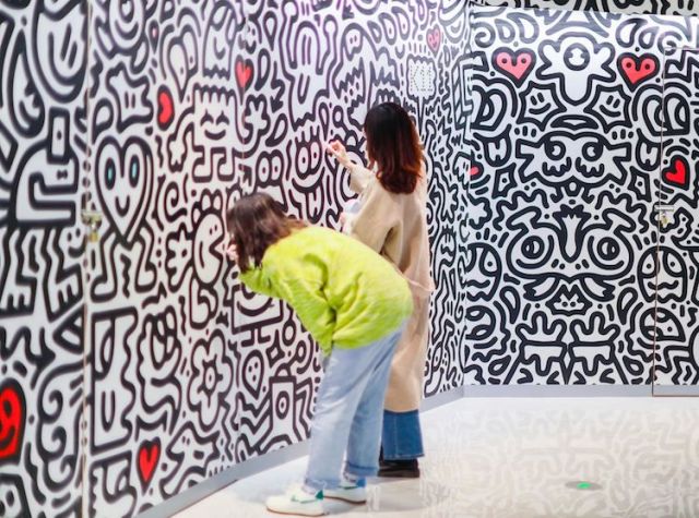 British artist Sam Cox creates bold, densely-packed drawings under the moniker Mr. Doodle. Made up of symbols, characters, shapes, and other motifs, these sprawling scribbles are as iconic as their creator. And while it may be hard to extract what is going on in these clustered pieces, most of their inspiration derives from Mr. Doodle’s life. His first solo exhibition Mr. Doodle in Love has debuted at Shanghai K11 Art Museum and chronicles the artist’s romance journey.
