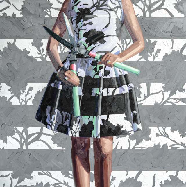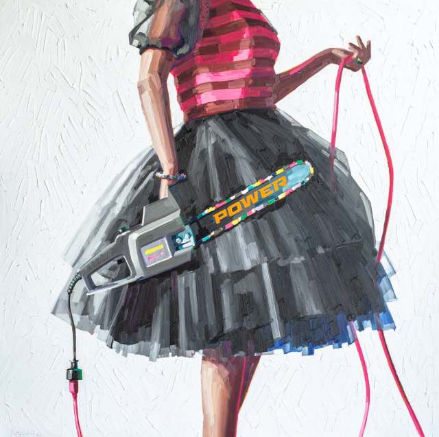 In recent years, Reemtsen has gravitated toward oval canvases evocative of traditional portraiture, in addition to pedestals and ladders that elevate her subjects. “Are the women in my paintings trying to break through the glass ceilings or just escaping the current situation? I think most women are doing one or both at all times, consciously or not,” she shares. A series of chainsaw sculptures painted with vibrant, playful colors augments the artist’s broader questions concerning how “the tools available to us shape who we are and who we want to be. I find using tools– whether a printmaking press, a chainsaw, makeup, or anything else– to be incredibly empowering as a vehicle for initiating change.”[…]