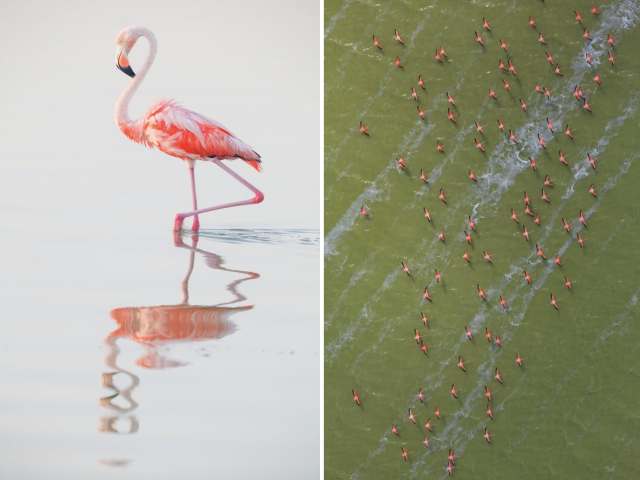 Right: An aerial view of flamingos on Mexico’s Yucatán Peninsula