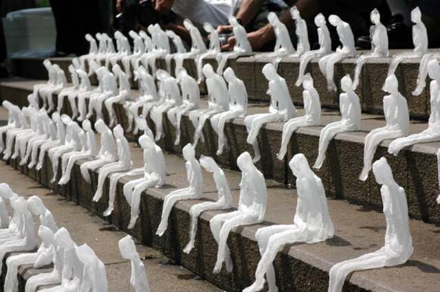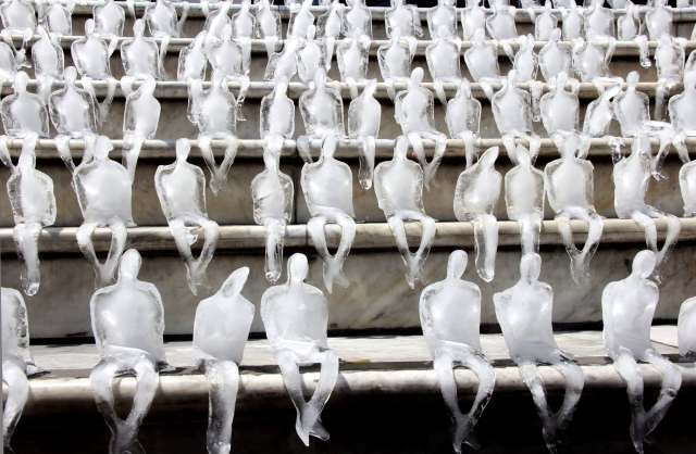 First exhibited in Campinas, Brazil, in 2001, the installation, which Azevedo dubs an “urban art action,” has found its way to cities like Paris, Belfast, Lima, and Porto. In each iteration, the artist carves hundreds of 20-centimeter-tall figures seated with their ankles crossed and places them atop outdoor steps and in public spaces. The faceless sculptures drip and pool into small puddles as time passes, which initially was Azevedo’s way of critiquing public monuments and taking “into account the history of the defeated, the anonymous, to bring to light our mortal condition.” The impermanence of the frozen substance directly contrasts the enduring nature of bronze, stone, and other materials typically used for statues and commemorative works.