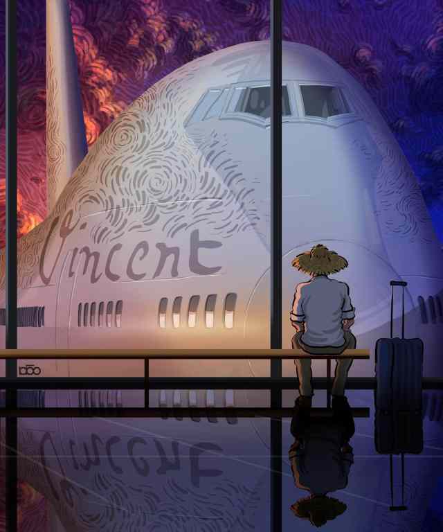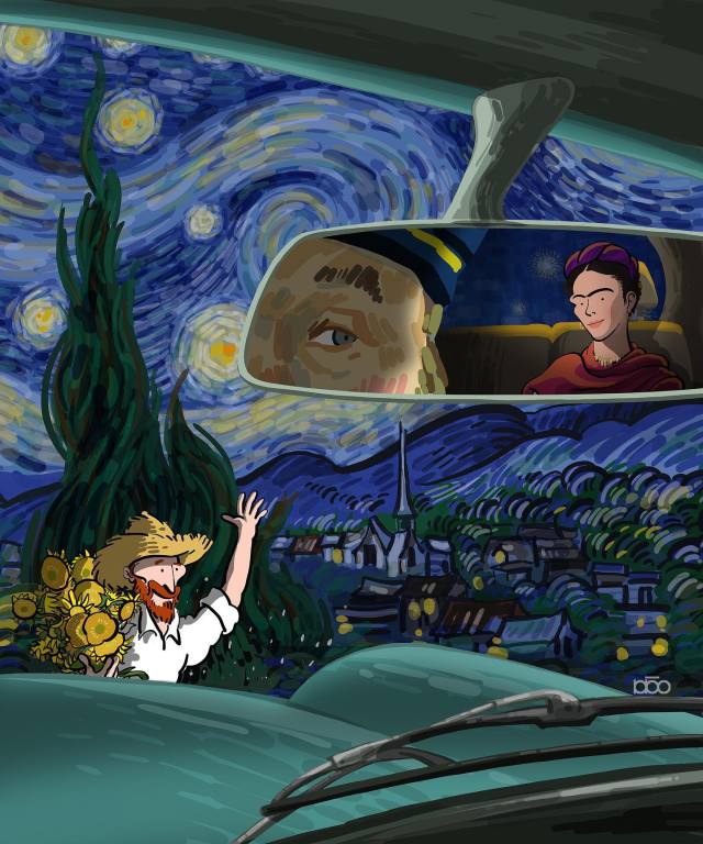 Moghaddam has been producing illustrations of Van Gogh for years. As the series lives on, his work continues to evolve. His latest pieces showcase the heavy swirling brushstrokes for which the painter is well known, but the content has Moghaddam venturing into the fantastical. Van Gogh is seen interacting with the likes of Frida Kahlo, and he is introduced to contemporary technology and airplane travel. The modern luxuries, especially, are well beyond Van Gogh’s time; he died by suicide in 1890.