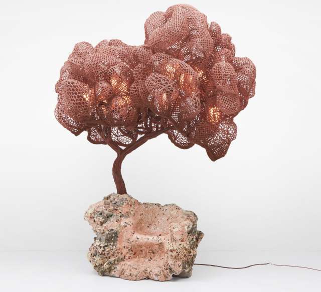 “One-Seater Concrete Tree” (2022), metal mesh, cork, steel, concrete, light fittings, 139 3/4 x 74 3/4 x 112 1/4 inches. All images courtesy of Carpenters Workshop Gallery