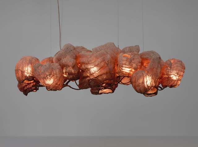 “Candy Cotton Long Coccoon Chandelier” (2022), metal mesh with paverpol and pigments, metal welded branch, silicone cable, light fittings, 31 1/2 x 106 1/4 x 39 3/8 inches