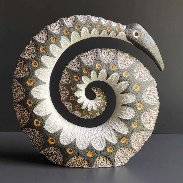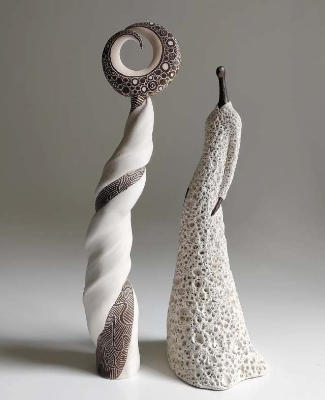 From masses of the natural material sourced from the countryside, he shapes tall, slender figures wearing pocked gowns, abstract pieces that twist upward, and minimal owl-like creatures, some with sleek feathers and others with rough, bumpy plumage. Each ceramic piece is carefully molded, fired, and covered in terra sigillata, the lustrous clay slip coating that functions similarly to a glaze while not masking the texture of the sculpture’s surface.