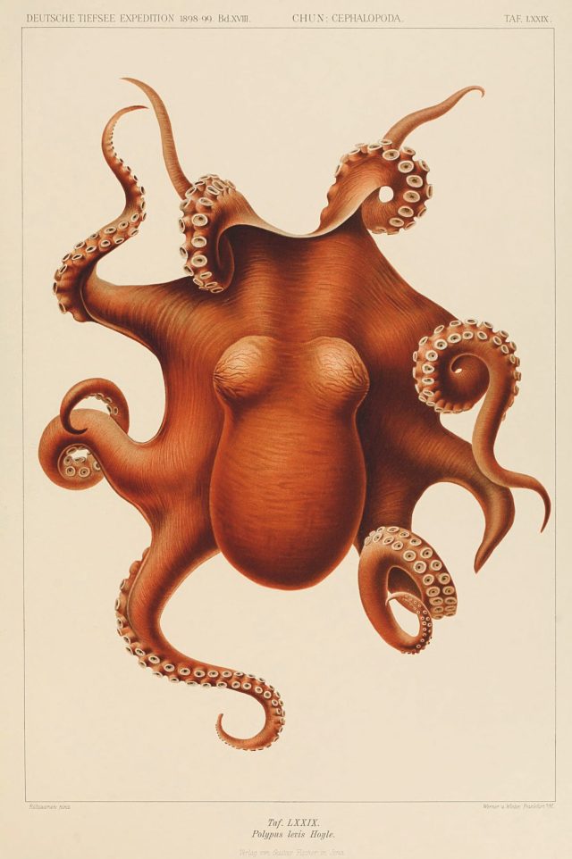 Carl Chun, Polypus levis, from Die Cephalopoden (1910–15), color lithograph, 35 × 25 centimeters. Image from the Biodiversity Heritage Library/Contributed by MBLWHOI Library, Marine Biological Laboratory, Woods Hole Oceanographic Institution Library, Massachusetts. All images © Phaidon,