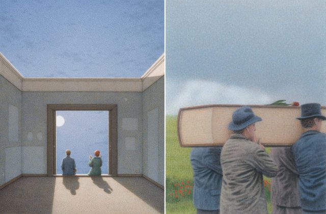 When viewing the uncanny scenes of Munich-based artist Quint Buchholz, it’s evident that play, experimentation, and exploring the uncharted are central tenets of his practice: a string quintet precariously balances above the sea, sightseers take advantage of the view atop a giant man, and a pigeon doubles as an apartment complex.