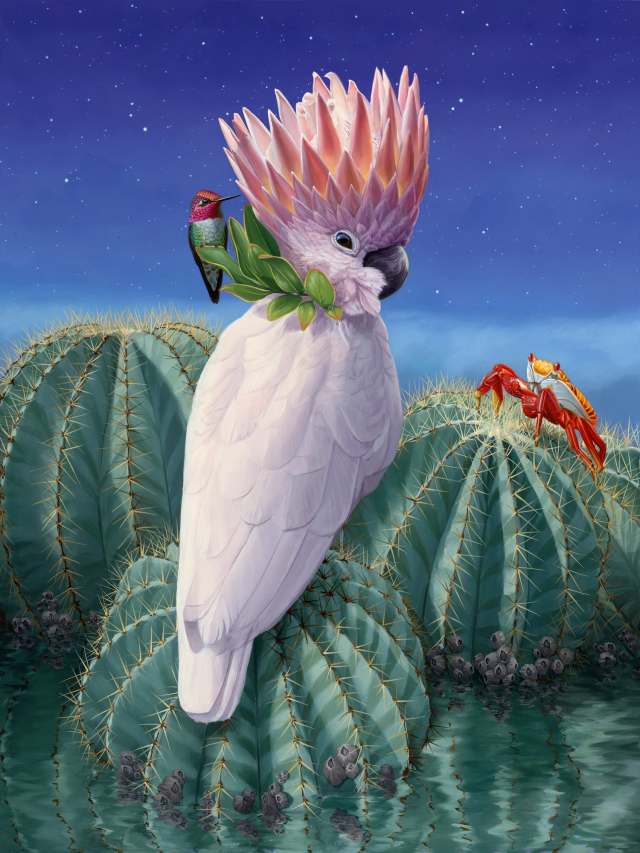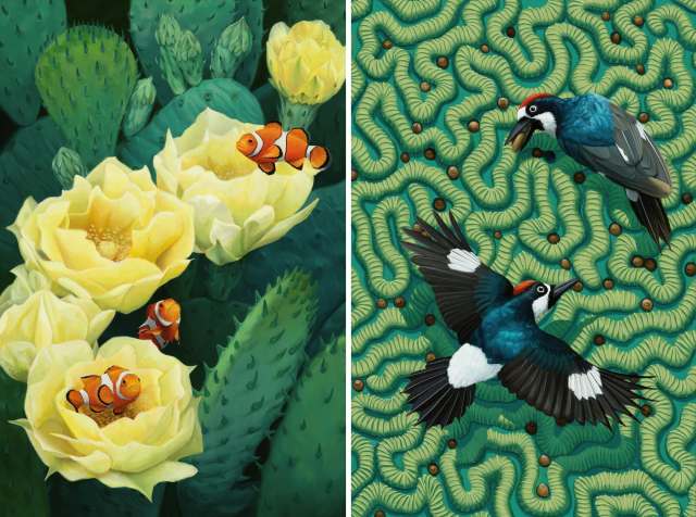 Los Angeles-based artist Jon Ching imagines the fantastic possibilities of melding Earth’s flora and fauna, rendering bizarre creatures with mushroom feathers and striped tulip fins. His latest oil paintings, which are on view this fall in Habitat at Beinart Gallery, extend this interest in hybridity by blending aquatic, aerial, and terrestrial organisms and their environments.