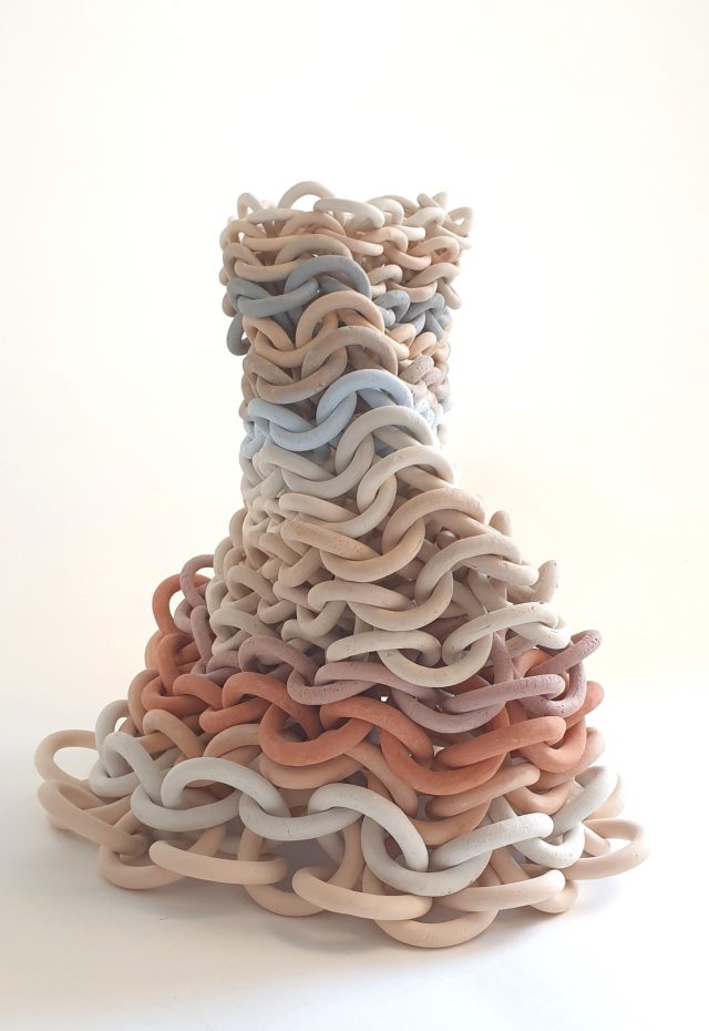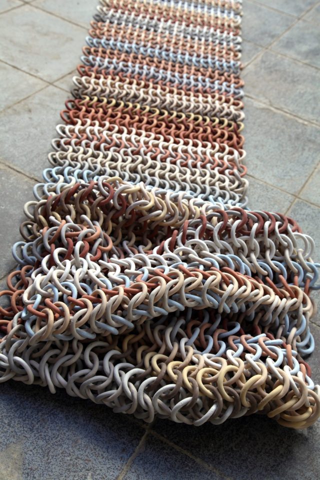 Constant motion and transformation underpin ceramic artist Cecil Kemperink’s philosophy, drawing inspiration from the rhythms of nature. Since 2019, she has lived on Texel, an island north of The Netherlands in the Wadden Sea that’s recognized by UNESCO as the largest continuous, undisturbed intertidal ecosystem in the world. The infinite crashing of waves on the shore, grasses or branches waving in the wind, and the way humans interact with these phenomena inspire the artist’s linked, organic pieces that combine sculpture with performance (previously). Her work centers on a sense of connectedness, both ecological and within our communities, that manifests symbolically in the form of links that expand and contract like ceramic chainmail.