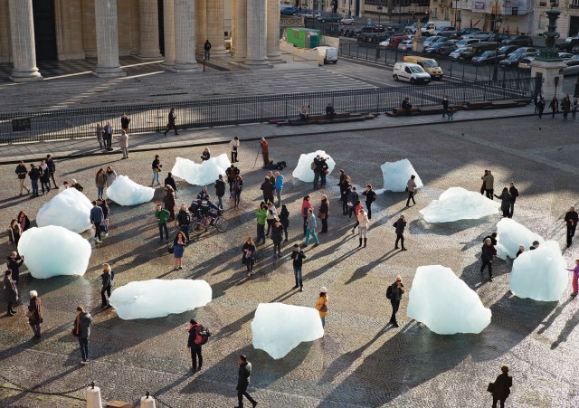 “Ice Watch” (2014), with Minik Rosing, 12 blocks of glacial ice, dimensions variable, installation views at Place du Panthéon, Paris. Photo by Martin Argyroglo