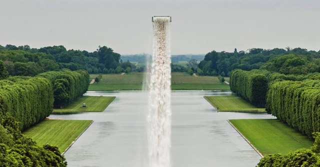 “Waterfall” (2016), crane tower, water, stainless steel, pump system, hoses, ballast, 42.5 x 6 x 5 meters, installation views at Palace of Versailles. Photo by Anders Sune Berg
