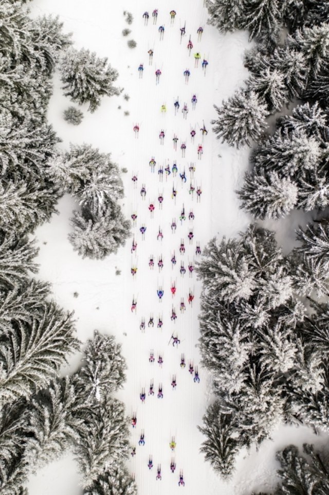 “The photo taken in March 2022 shows the competitors of the annual ski event: Bieg Piastów held in Szklarska Poręba, at its 46th edition. Skiers whiz in their colorful clothing along the track surrounded by snow-covered trees.”