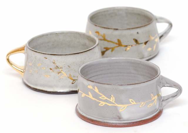 Danielle Carelock, “Foliage Mugs,” earthenware, hand-painted luster overglaze, 2 × 4 inches.