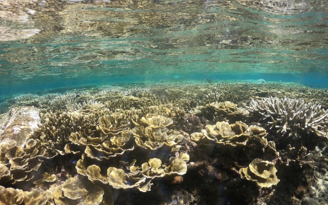 Healthy hard corals in a shallow-water reef. Will this be a rare sight in the near future? Photo © K M Stiefel