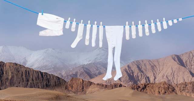 Artist Helga Stentzel hangs socks, undergarments, and sweaters in playful compositions that appear like animals in a landscape.