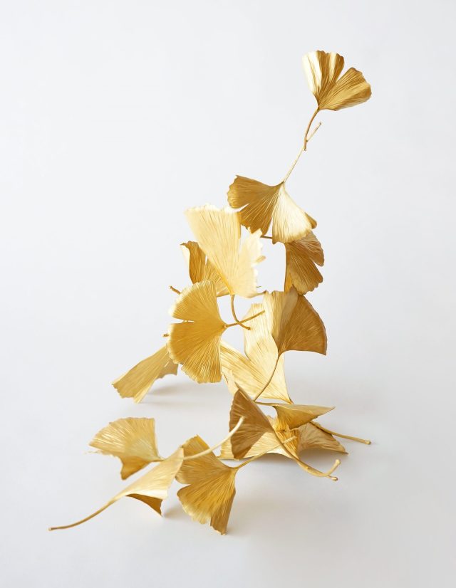 Tender stems bear lush blooms and windswept leaves gather around new growth in artist Shota Suzuki’s delicate metal sculptures. Rendered in painstaking detail, the forms are inspired by flora around his home and studio in Kyoto, such as Japanese maple trees and dandelions that have gone to seed. “Recently, I have been adding rain and wind to my work,” he tells Colossal, sharing that he’s inspired by the way nature demonstrates the passing of time. He adds silvery water droplets to ginkgo leaves, ruffles the petals of flowers, or portrays a branch of cherry blossoms as if it has blown from a tree.