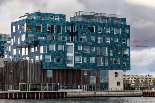 The Copenhagen International School building in Denmark, features 12,000 blue-hued but transparent solar panels with DSC technology. (Photo: ALEXANDER2323/Depositphotos)