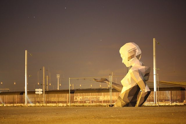 When we think of unexpected installations or graffiti art in general, we don’t often imagine something life-size. However, artist David Mesguich uses his background in graffiti and years of creative experience to push the boundaries of his experimental projects. His piece, Pressure 1.2, features a massive geometric sculpture of a female figure gesturing with one raised arm, which Mesguich constructed in his studio before abandoning it near a train yard in Nantes, France.