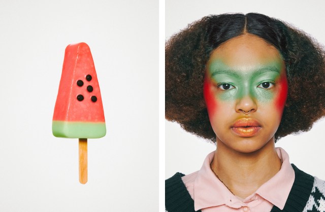 London-based artist and creative director Max Siedentopf has a knack for portraying more than meets the eye in his distinctive portraits. A series titled Pleasure Portraits looks forward to summer, featuring the distinctive pastels and jewel tones of ice cream bars alongside subjects whose decadent makeup mimics the hues and embellishments of their paired confection.