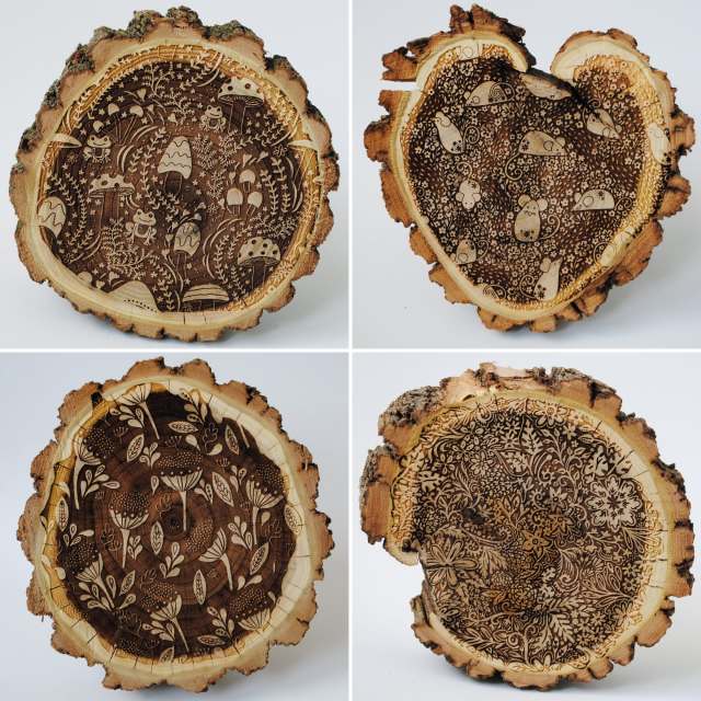 Designer Zoe Feast has an affinity for patterns, and her practice revolves around motifs of flora, fauna, and organic forms that she creates for a variety of personal projects and commissions. After a visit to her local library and an encounter with its laser engraver, Feast decided to translate her whimsical illustrations to a three-dimensional surface. She sourced slabs of wood from a nearby habitat restoration project and carved seals in whispy waves, hedgehogs lounging among flowers and foliage, and a family of wide-eyed owls perched on branches. Nestled within the gnarled, bark-laden edges, the woodland creatures add a playful texture and motif to the raw material.[…]