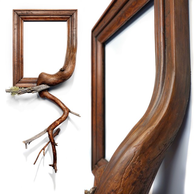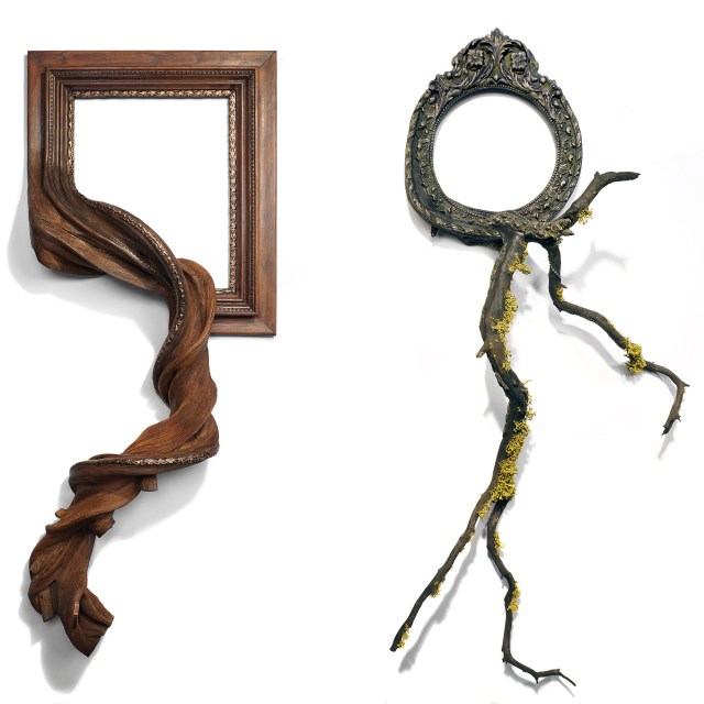 In Darryl Cox’s organic sculptures, gnarled tree roots or branches merge with the ornate grooves, patterns, and gilding of picture frames. The Bend, Oregon-based sculptor (previously) continues to explore the material possibilities of wood and its relationship to domestic interiors and the natural environment in the series Fusion Frames.