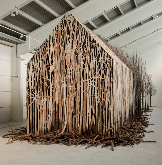 Salcedo is known for sculptures and installations that incorporate quotidian, domestic objects like tables or garments. Her practice often takes historical events as a starting point, focusing on the effects of major political actions on people’s everyday mental and emotional experiences. “Conveying burdens and conflicts with precise and economical means,” she once cataclysmically cracked the floor of Turbine Hall in London’s Tate Modern and lowered more than 1,500 chairs between two buildings in Istanbul to address displacement caused by war. In “Uprooted,” the theme of migration continues in the form of hundreds of dead trees that have been shaped into the recognizable silhouette of a house, its meticulously constructed walls and pitched roof gradually morphing into a thicket. […]