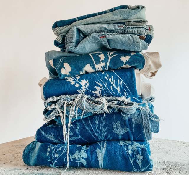 Artist and photographer Kellie Swanson imprints jackets, jeans, and other garments with the rich blue of cyanotypes—an early form of photography that uses UV light to produce monochromatic prints—as part of her burgeoning clothing line KSX. With grainy textures that complement the weave of fabrics, the brilliantly hued wearables feature natural specimens like ferns and flowers found around Swanson’s home in Bozeman, Montana. All of the garments are secondhand, and the artist sources most from thrift stores and vintage shops, ensuring KSX takes a more sustainable approach in an industry infamous for its waste.