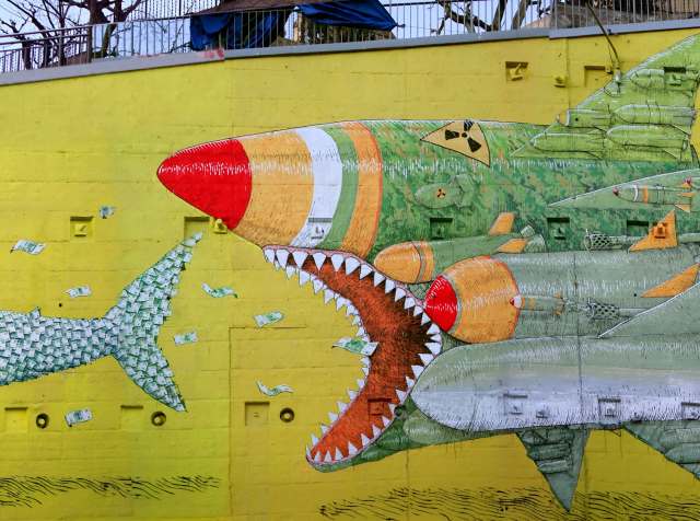 An updated mural from the anonymous Italian street artist Blu (previously) sinks its teeth into capitalistic greed and nature’s unparalleled capability for destruction.
