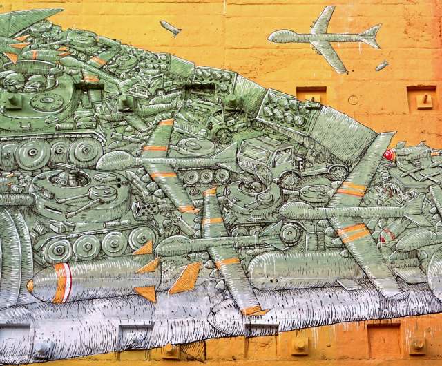 Retaining the bank-note shark of the 2009 work, the 2023 version adds an arsenal of nuclear missiles and warplanes to the central creature. The expansive mural continues to unfold like an exquisite corpse of global maladies with raging forest fires and floods encroaching on civilization, leaving mass chaos and ruin in their wake.[…]