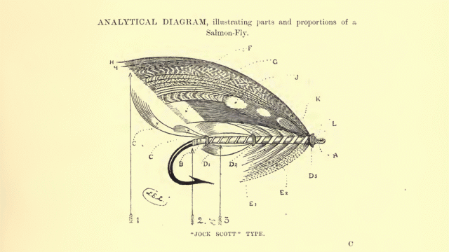 An “analytical diagram” illustrating the various parts of a Jock Scott salmon fly. George M. Kelson’s The Salmon Fly: How to Dress It and How to Use It (1895)