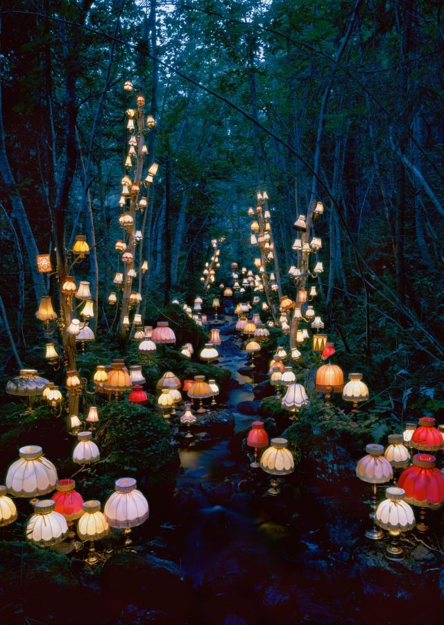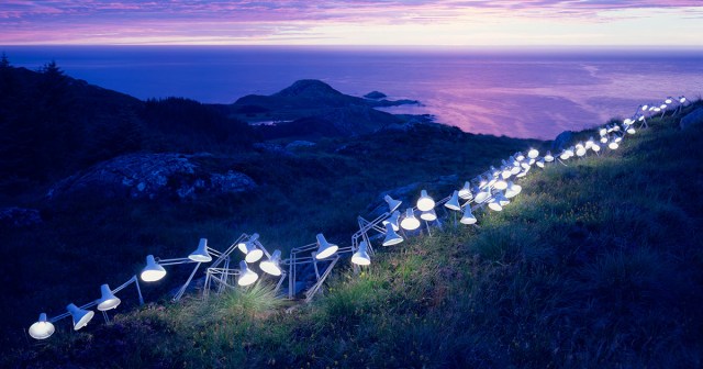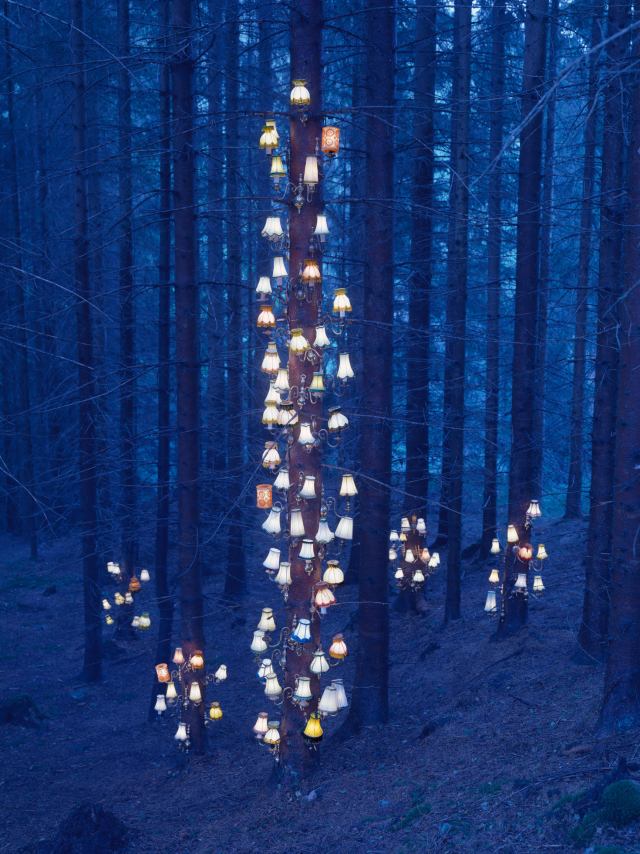 Tucked away in forests and along shorelines, Norwegian artist Rune Guneriussen’s mystical, illuminated installations appear to spontaneously emerge from within the landscape. Lamps, blocks, and salvaged wood comprise an array of elaborate sculptural works that he meticulously arranges among trees, along bluffs, and in the sand. He is interested in a process that explores the relationships between objects, location, narrative, and the time that the work is made.